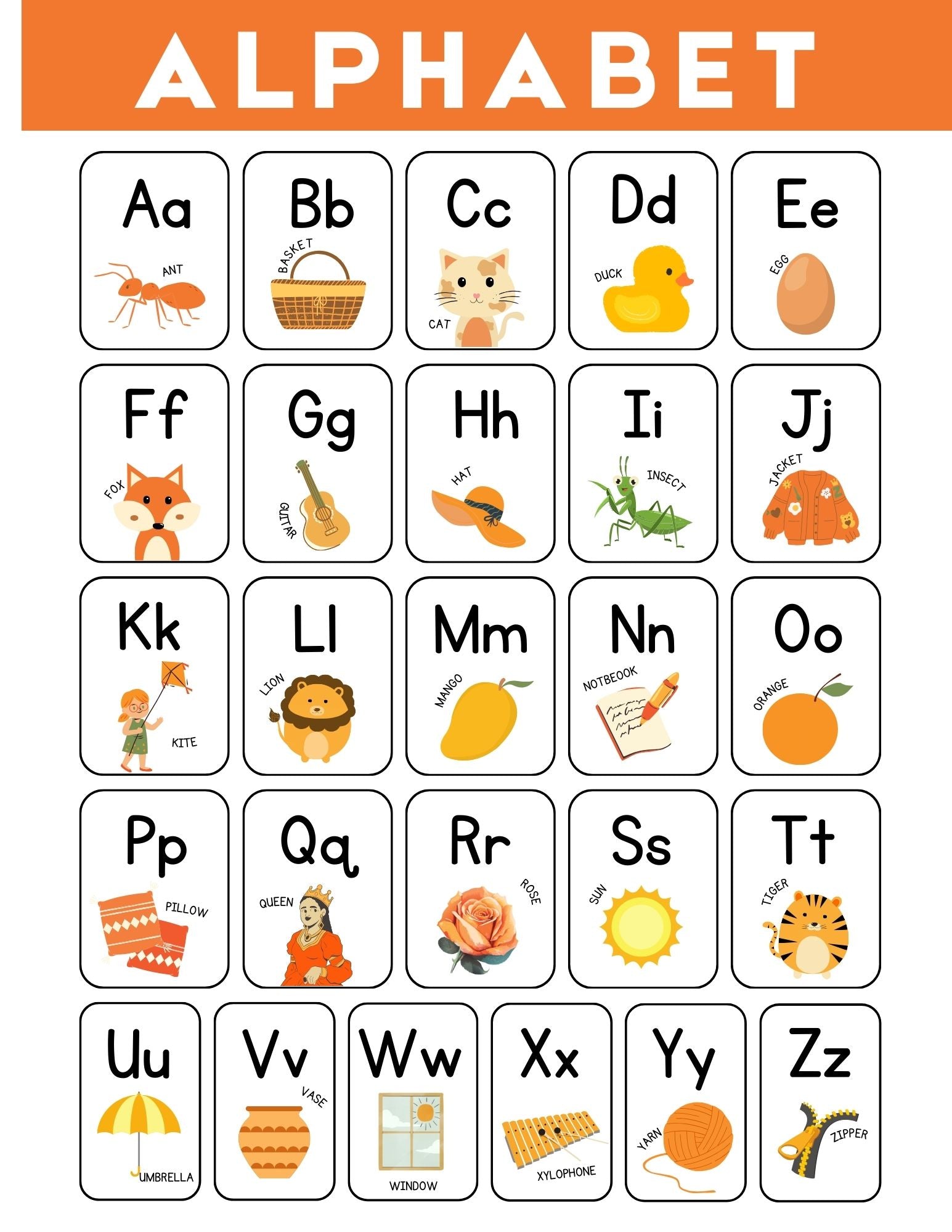 Help young learners explore the alphabet with this bright and friendly Alphabet Chart A–Z, designed for preschool and early learning. Each letter features both uppercase and lowercase forms, paired with simple, cute illustrations to support letter recognition and vocabulary development.