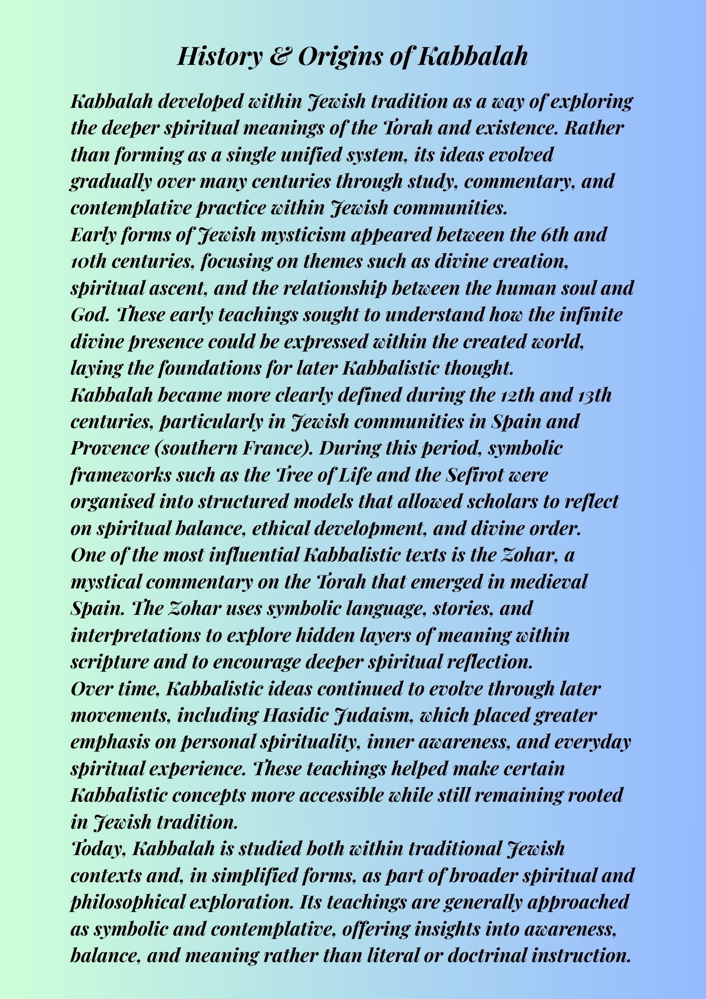 Readers are introduced to how the Tree of Life is used symbolically to reflect themes of balance, awareness, and inner development. The guide also includes a brief history of Kabbalah, outlining its origins, key influences, and how its ideas have evolved over time.