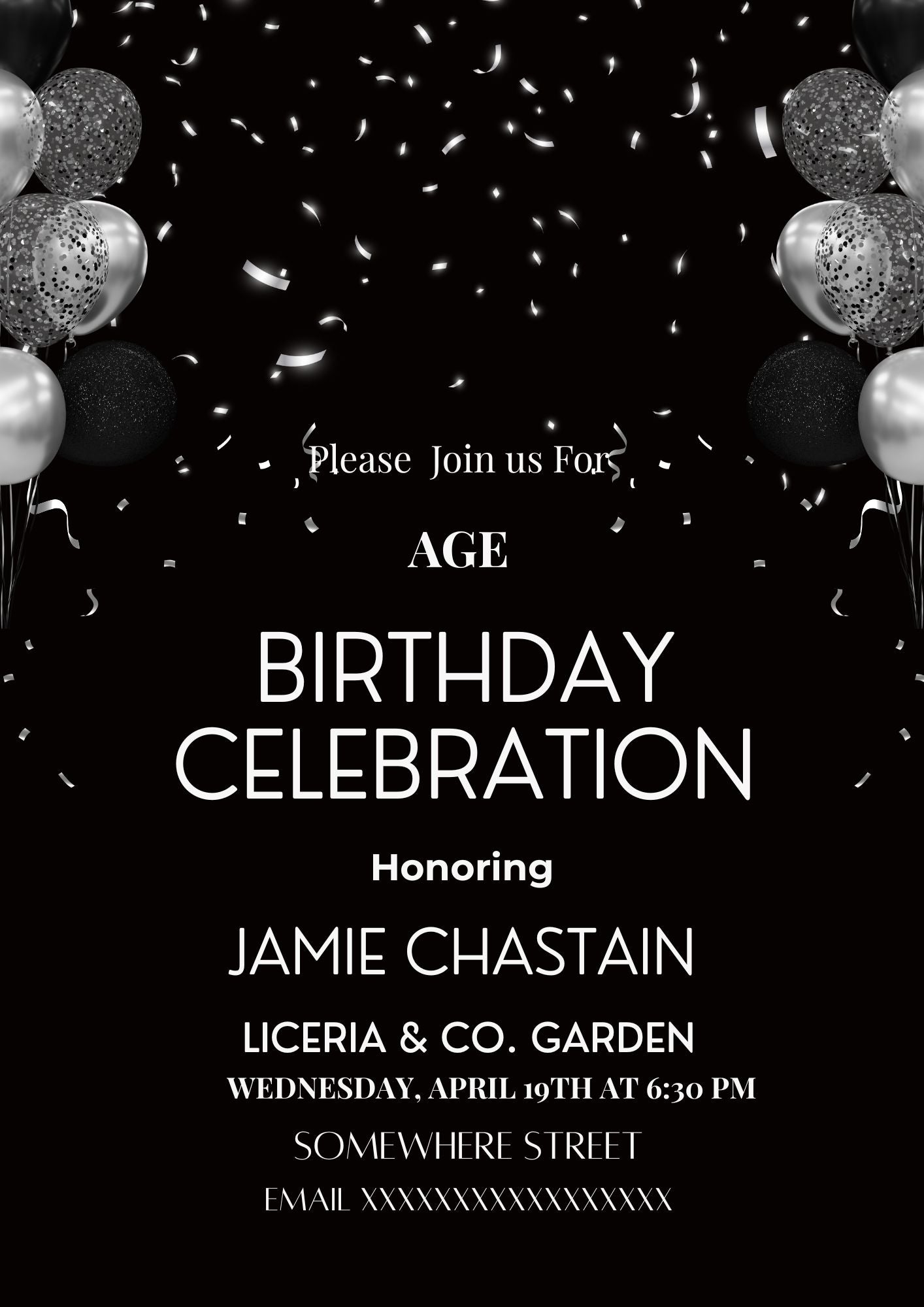 Celebrate in timeless style with this Elegant Black Birthday Invitation, designed for sophisticated adult birthday celebrations. Featuring a modern black background with subtle confetti and balloon accents, this invitation is perfect for milestone birthdays, dinner parties, and evening events.What’s included: