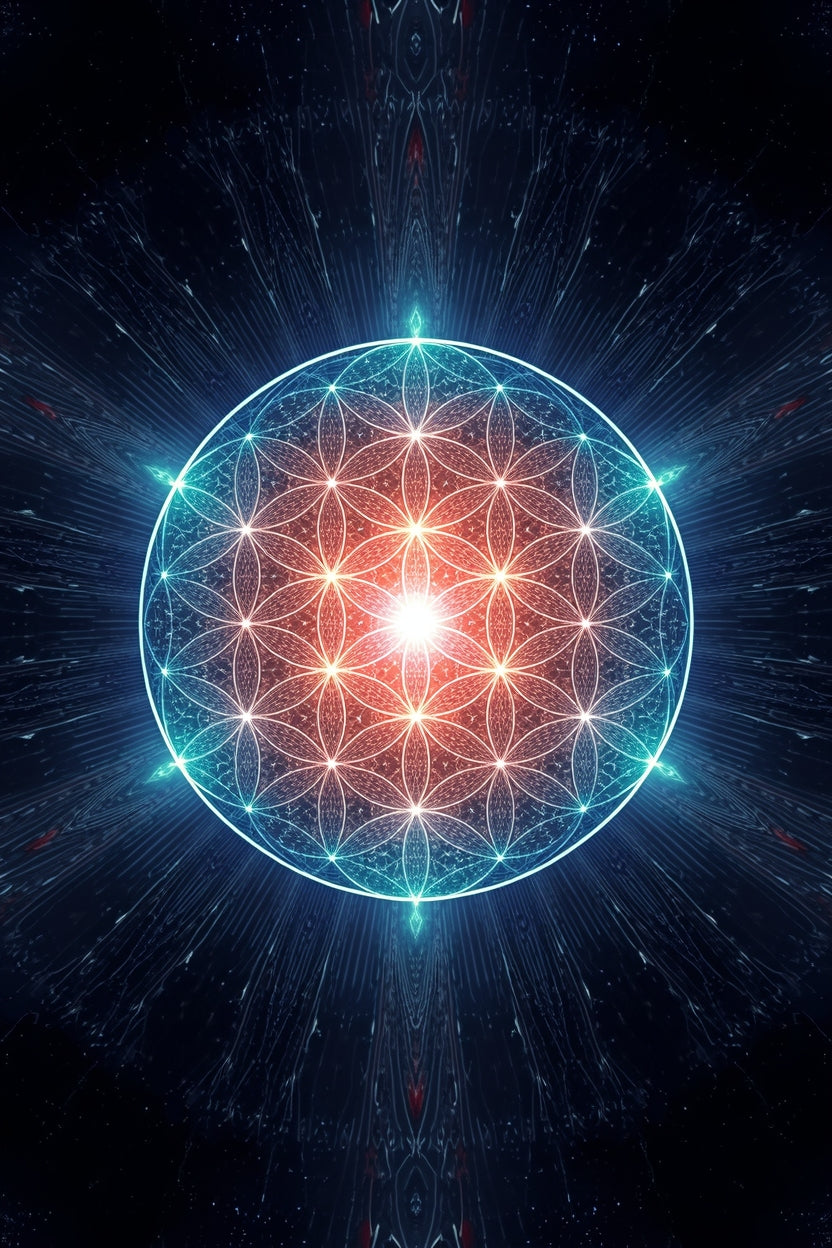 This sacred geometry artwork features a luminous mandala inspired by ancient geometric patterns symbolising harmony, balance, and universal connection. Radiating from a glowing central point, the design blends precision geometry with flowing light energy, creating a calm yet powerful visual presence.